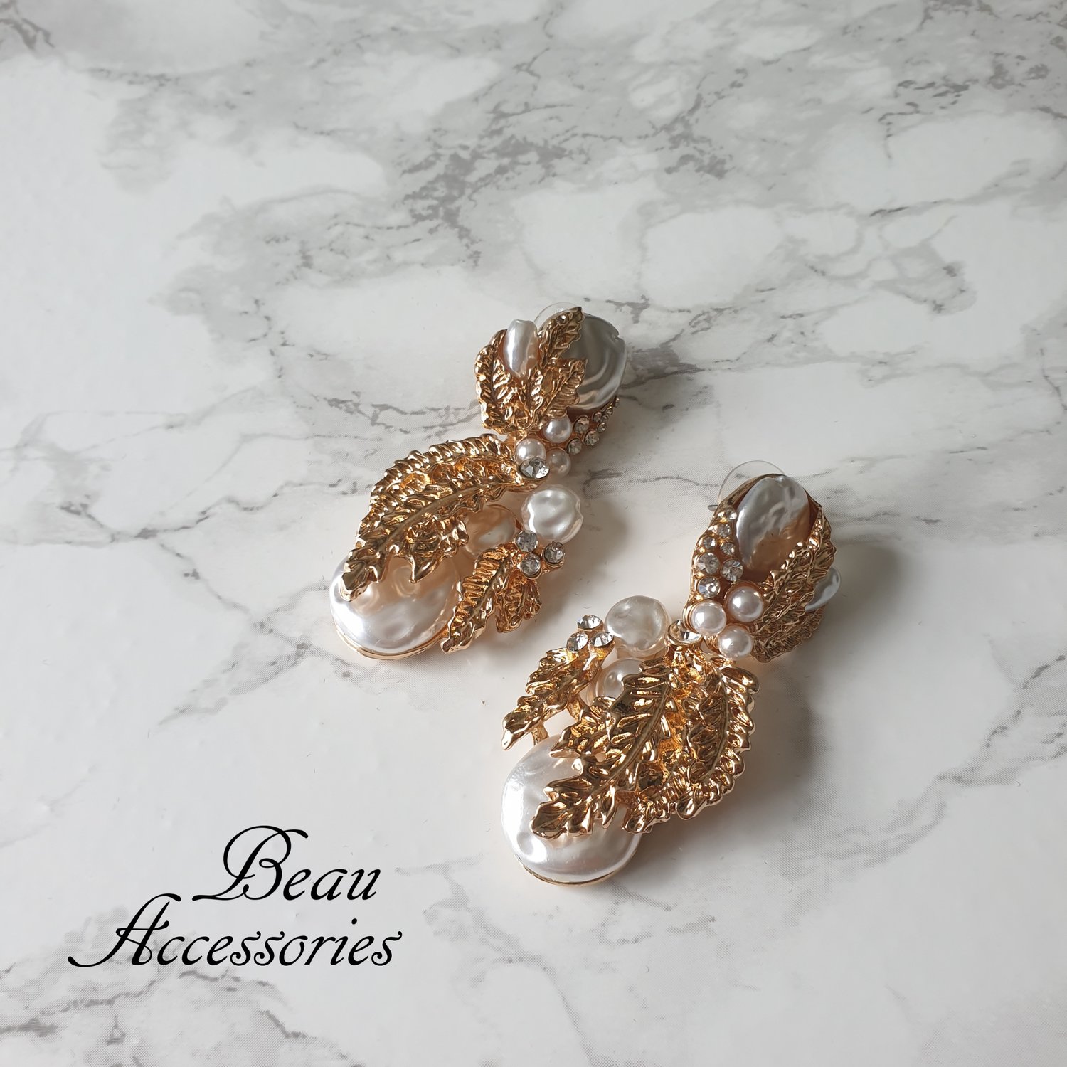 These beautiful earrings have scattered faux pearls of all sizes carefully placed on the earrings with tiny rhinestone crystals to add sparkle.
